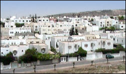 moderne Reihenhäuser mit einem Obergeschoß im Stil arabischer Bauart. Meistens schließen sich mehrere Häuser zu einem Viereck mit innenliegenden Höfen zusammen. Durch das leicht ansteigende hügelige Gelände sind die Häusergruppen unterschiedlich versetzt angeordnet, die Siedlung wirkt dadurch sehr aufgelockert und natürlich. An der Straßenseite hat jedes Haus seinen Garten. Das üppige Grün der Sträucher in den Gärten mit den kräftigen Farben der Blüten und das